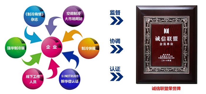 中國制冷行業誠信聯盟是由一個第三方權威機構、一支線下隊伍、兩大行業媒體、兩大行業商務平臺共同組建的集基礎誠信認證、企業監督、商貿協調為一體的行業企業誠信保障聯盟。